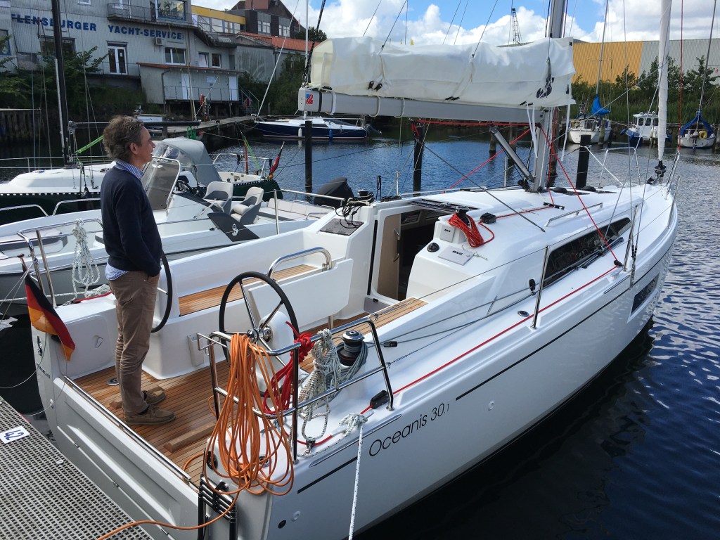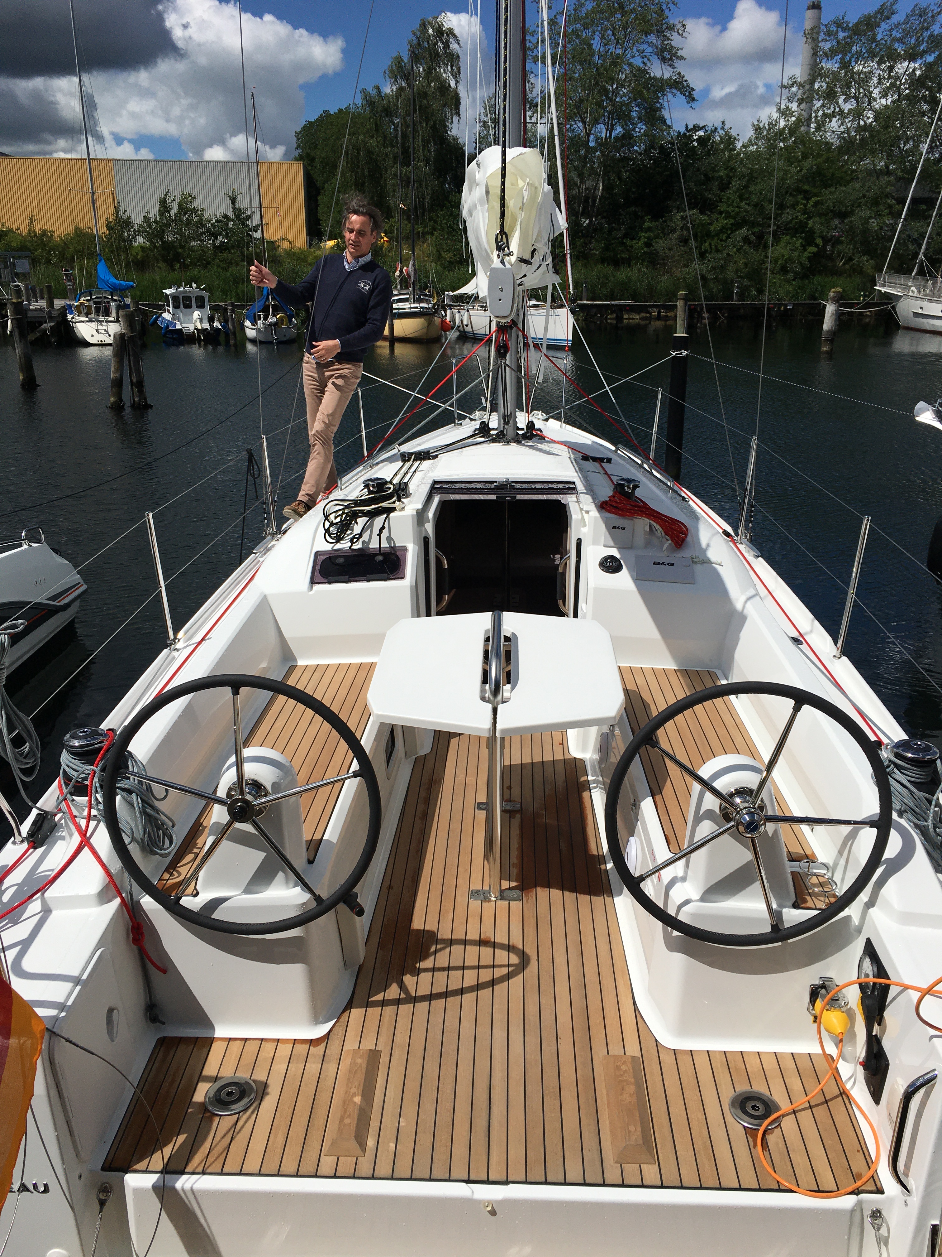 Die zwei Steuerräder sind zugegebenermaßen nicht wirklich erforderlich, die ebenfalls angebotene Pinne wäre für ein 9 Meter Boot auch ausreichend. Das Boot war vom Händler aber so bestellt und heute kann ich sagen, dass dieses Setup sehr gut funktioniert. Insbesondere der Durchgang in der Plicht zum Niedergang ist so sehr schön frei und beim Segeln kann man je nach Notwendigkeit von Luv nach Lee wechseln, ohne dass man auf Pinne, Ausleger und Schot achten muss.