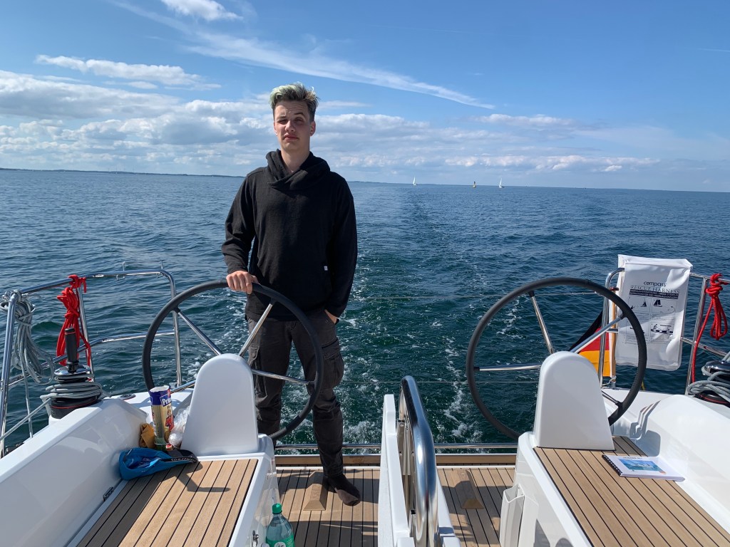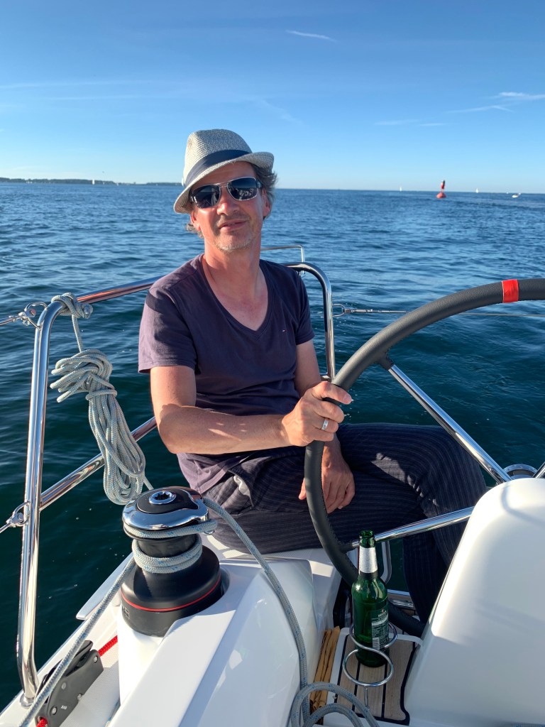 … und kann ganz bequem und schnell von Luv nach Lee wechseln, um in einem verkehrsreichen Revier wie der Kieler Förde, ordentlich Ausguck gehen zu können. Dabei stört nicht der Pinnenausleger, der sich in der Großschot verheddert.