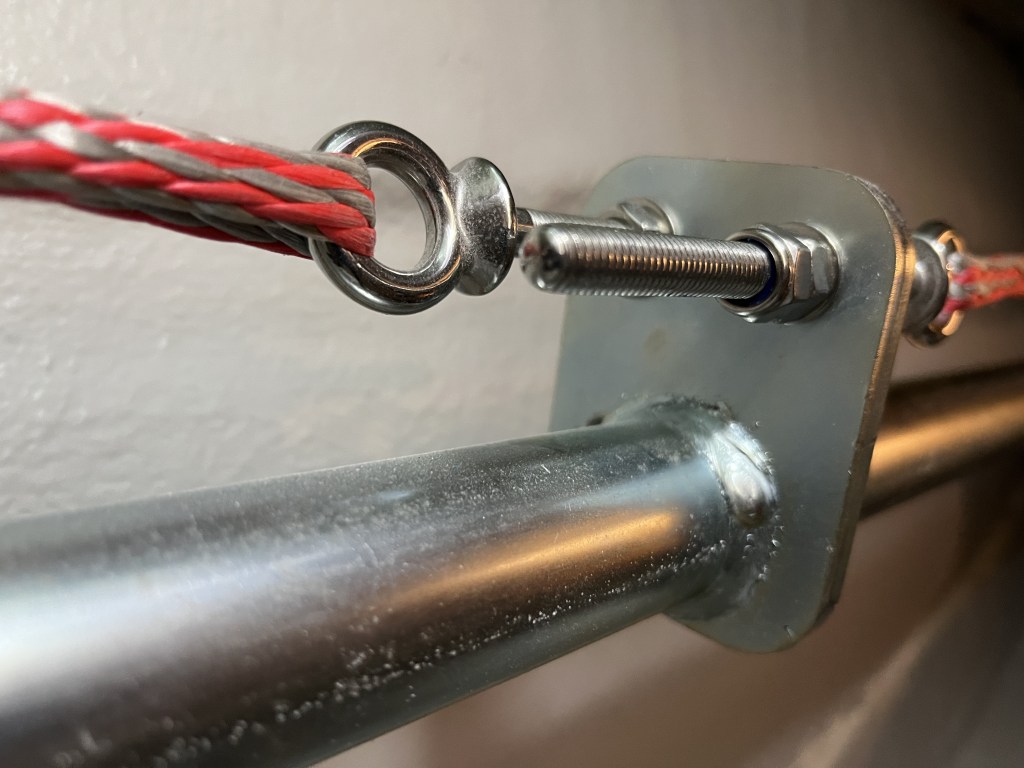 Die Einstellung des Spiels der Ruder erfolgt von der Achterkoje aus. Öffnet man dort die Luke in der Rückwand, gelangt man zu der Steueranlage. Dort kann man die gekonterten M8 Muttern nachziehen und so das Steuerseil spannen.