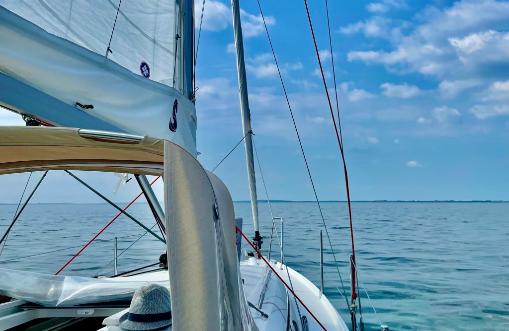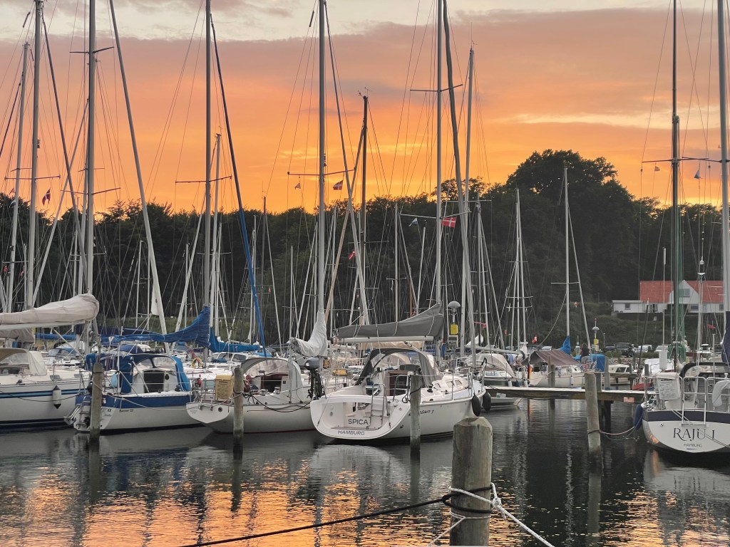 Wir sind abends von der Schlei angekommen und haben trotz Hochsaison ohne Problem einen guten Liegeplatz bekommen. Auf der Überfahrt war es erstmalig so warm, dass wir das Fenster des Sprayhood öffnen mussten.