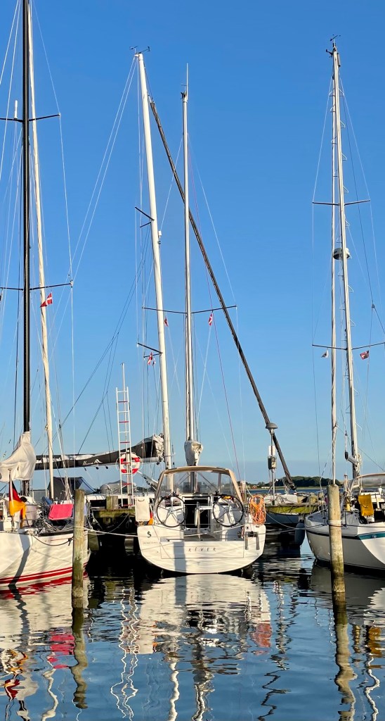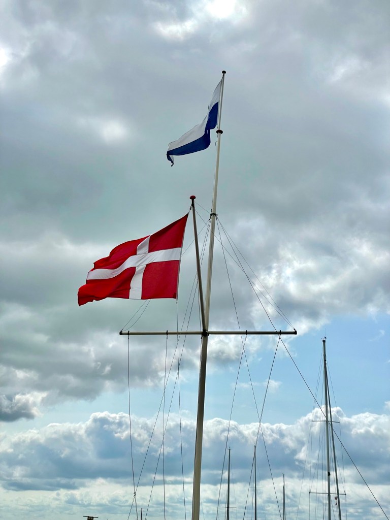 Am nächsten Morgen – nachdem bei Sonnenuntergang von einem deutschen Gast mit Trompete eine Flaggenparade gespielt wurde und alle Yachten Nationale und Gastlandsflagge unter Applaus eingeholt hatten – haben wir entschieden noch hier zu bleiben und einen Tag Baden zu gehen. Natürlich haben wir Gastlandsflagge und Nationale morgens wieder gemeinsam mit den Flaggen des Hafens gesetzt. In Dänemark ist dies auch ein Zeichen des Respekts.