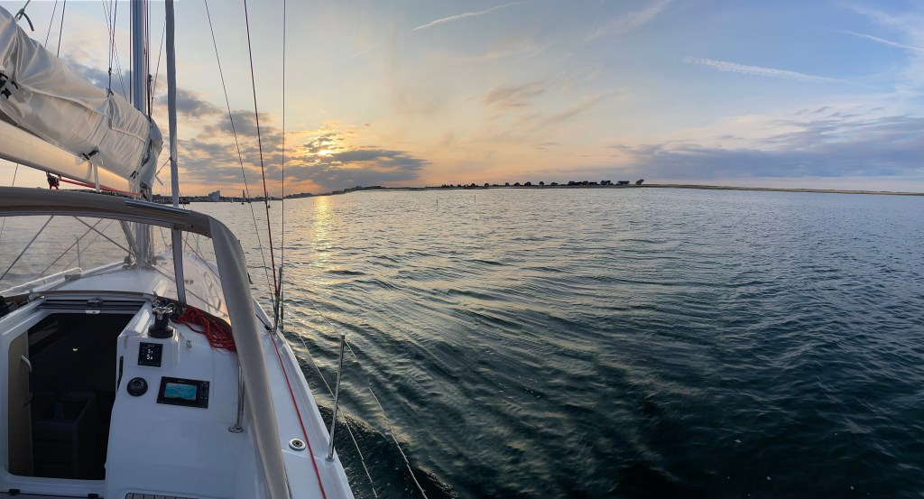 Der Sonnenaufgang am nächsten Morgen um 6 Uhr ließ sonniges Wetter erwarten. Wir wurden insoweit auch nicht enttäuscht. Nach einem ausgiebigen Frühstück (mit Heizung) stellten wir fest, dass – wie vorhergesagt – so gut wie kein Wind war. Kurz vor dem Start setzte eine leichte Brise ein, so dass wir gut zur ersten Tonne segeln konnten; dann schlief der Wind aber leider erneut ein und wir wurden im Feld weit nach hinten durchgereicht. Die Schiffe mit Spinaker waren da doch deutlich im Vorteil. An der Kreuz im Norden der Insel konnten wir einige Meilen gut machen. Aber das Zeitlimit war schon jetzt kaum noch zu schaffen. Zwar kam wieder ein wenig Wind auf aber es war innerhalb des Zeitlimits nicht mehr zu schaffen. Der Veranstalter hat das Ziel dann nach Puttgarden verlegt und wir wurden als eines der letzten Schiffe im Zeitlimit abgeschossen. Seglerisch war es kein großes Glanzstück, aber wir hatten sehr gutes Wetter und damit auch Spaß. Auf der Rückfahrt unter Maschine malten wir uns erneut ein abendliches Anlegerbier (oder zwei, verbunden mit dem ein oder anderen Rum) aus. Gegen 19 Uhr waren wir zurück in Heiligenhafen