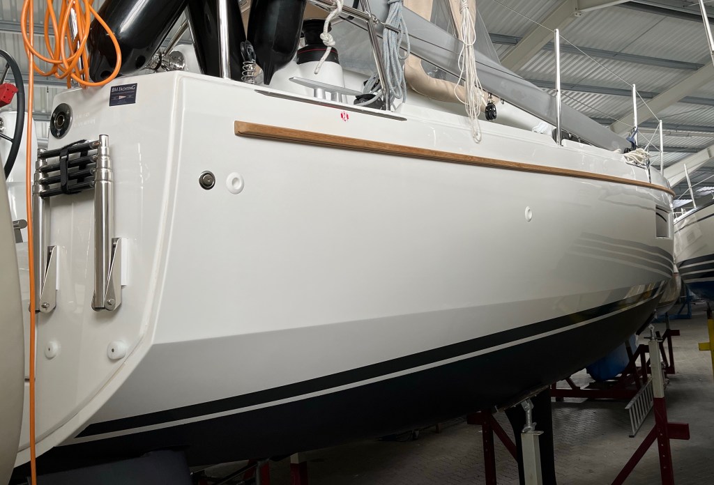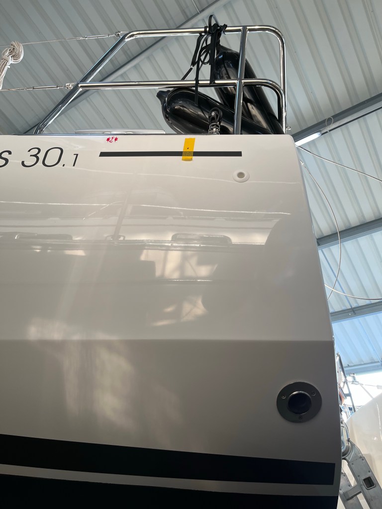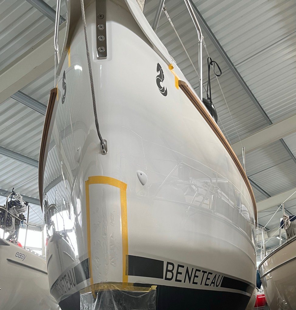 Letzte Woche war noch nicht klar, ob die Werft es rechtzeitig vor dem Auslagertermin am 06.04. schafft, die beauftragten Arbeiten auszuführen. Corona hat auch dort alles durcheinander gewirbelt. Die Werft sollte das Gelcoat am Bug ausbessern, und eine Teak Scheuerleiste anbringen. Gestern haben die Arbeiten nun doch begonnen.