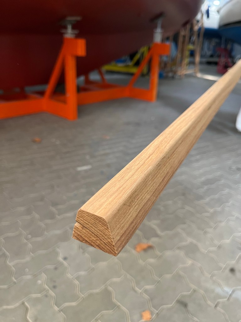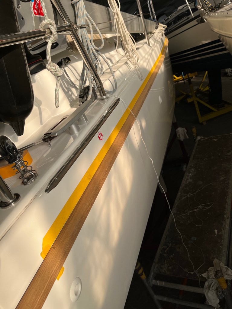 Auf der Steuerbordseite ist die Leiste bereits zum großen Teil probeweise angebracht, um Länge und Passung zu ermitteln. Es sind doch deutlich mehr Schrauben notwendig, als ich wegen der geringen Bauchigkeit meines Schiffes gedacht hatte. Ich hoffe, dass die Löcher noch mit Teak verpropft werden. Hatte ich gar nicht mit der Werft besprochen, gehört aber meines Erachtens zu einer fachmännischen Erstellung.