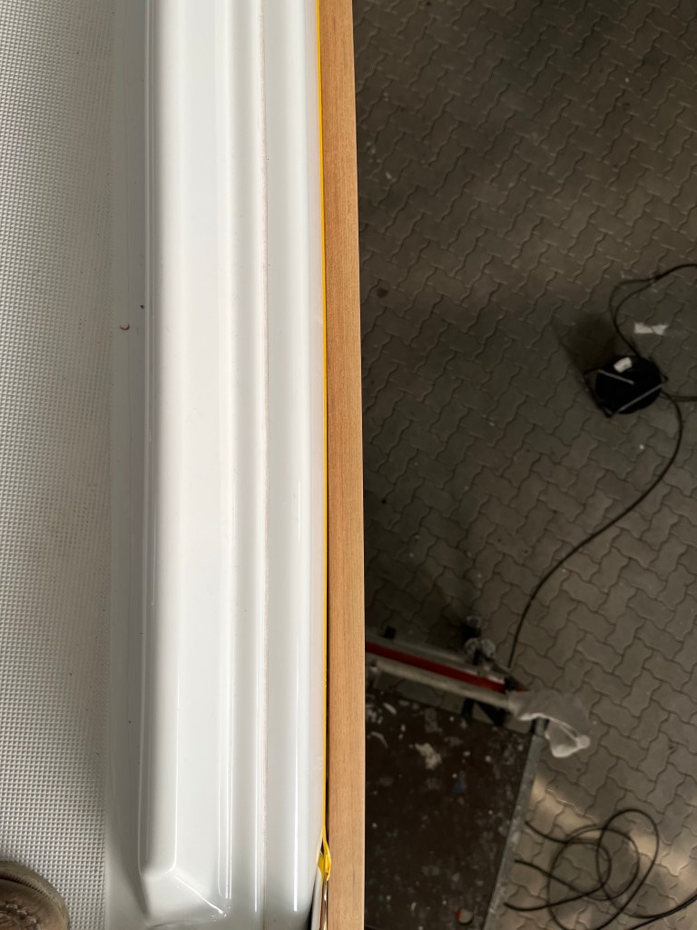 In der Werft wird die Leiste jetzt geschäftet und mit einer Tropfnase versehen, damit nicht so viele dunkle Dreckstreifen davon über den Rumpf runterlaufen.