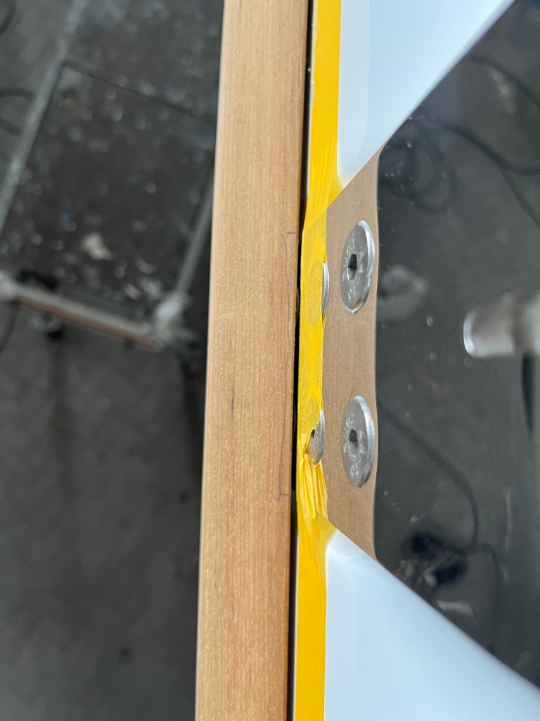 Darüber hinaus hat die Werft auch schon mal für die Scheuerleiste Maß genommen. Die Bohrlöcher wurden bereits per Tape festgelegt. Im übrigen soll die Teakleiste dann geklebt werden.
