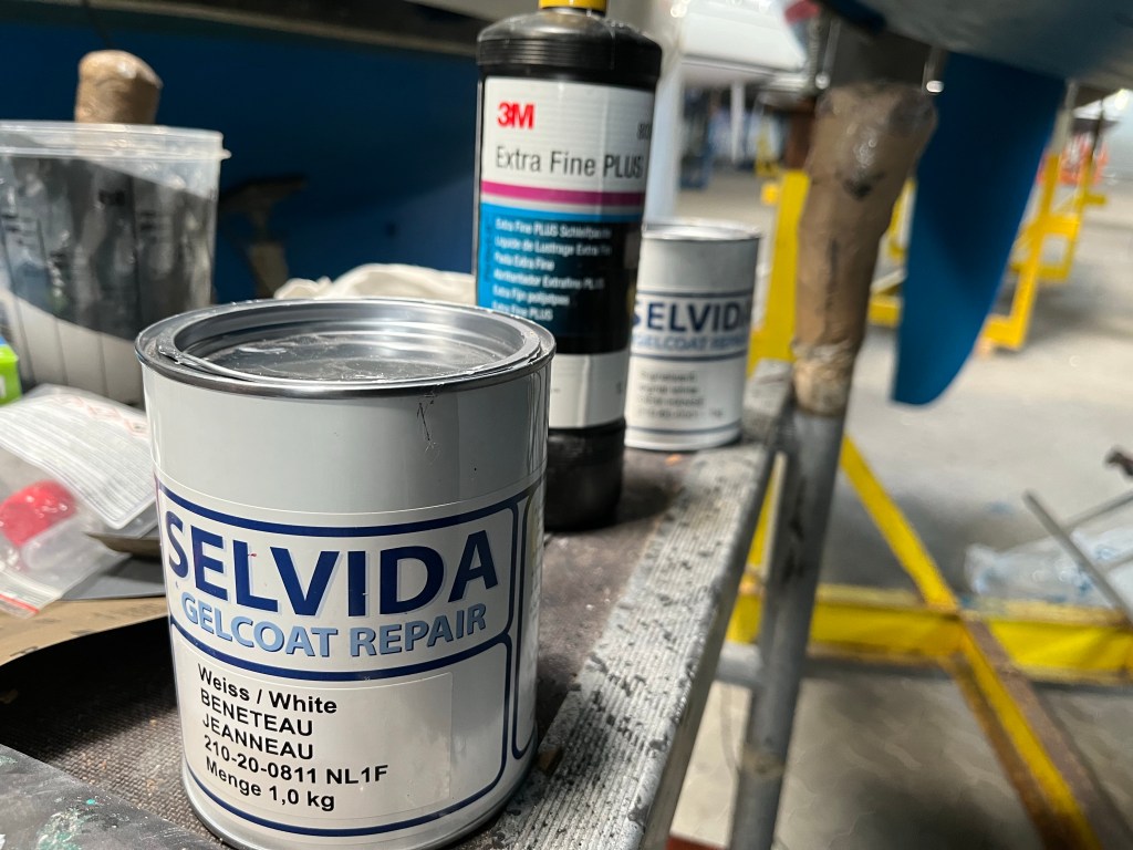 Oh nein! Heute wurde das Gelcoat wieder entfernt. Die Farbe stimmt nicht. Obwohl es das Original Gelcoat von Beneteau war, war es dunkler. Ausbleichen nach einem Jahr finde ich unwahrscheinlich. Warum passt die Farbe nicht?