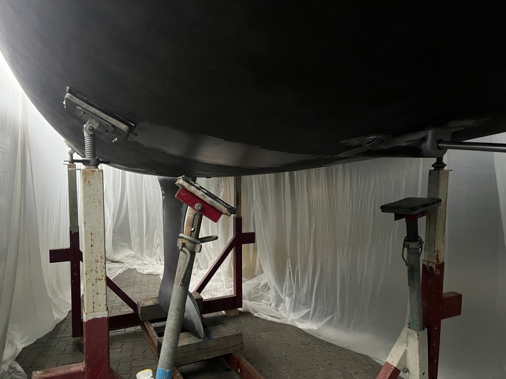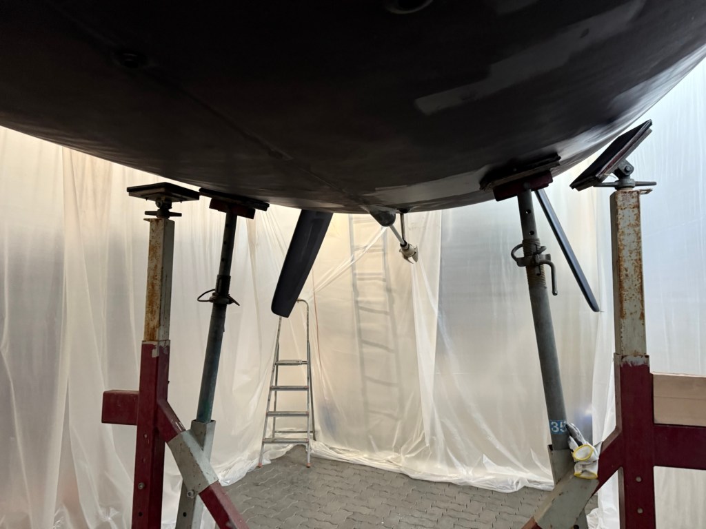 Jetzt müssen die zusätzlichen Stützen nach vorne, so dass ich dort unter den Pratzen streichen kann. Ich hoffe dass es dann zwei Tage warm genug zum Streichen wird. Dann kommt wieder Offshore EU von International drauf. Mal sehen wann es gute Antifouling ohne Biozide gibt. Dann wird das Unterwasserschiff einmal komplett neu aufgebaut.